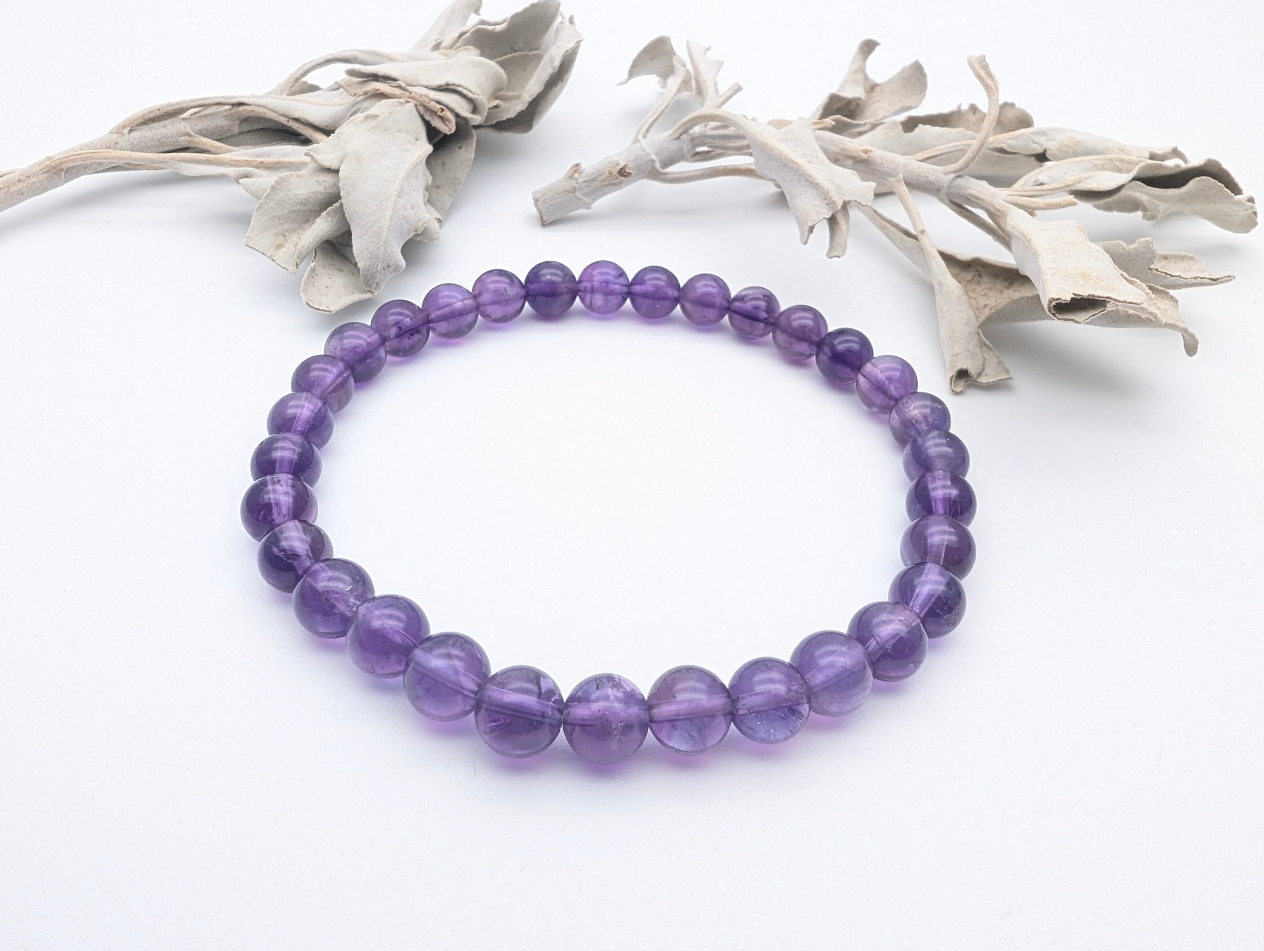 アメジストは紫色の濃淡が美しい宝石です。サイズや形状は多様なバリエーションをご用意しておりますので、お好みに合わせてお選びいただけます。6mm/女性標準16cm/男性標準18cm