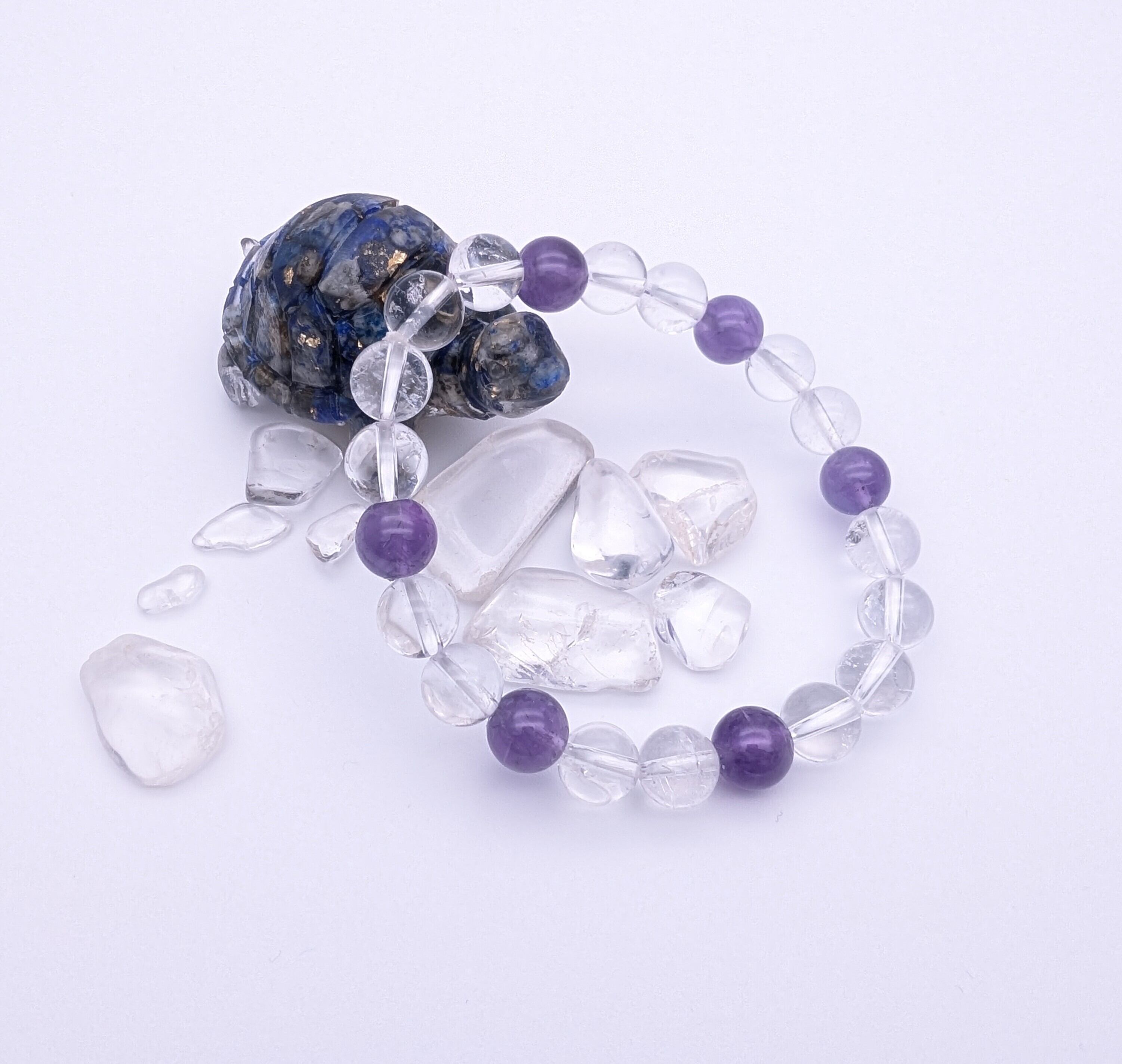 アメジストと水晶の2つの天然石が美しく組み合わさったこのブレスレットは、シンプルでありながらも存在感があり、着用するだけで特別な気分にさせてくれる力を秘めています。