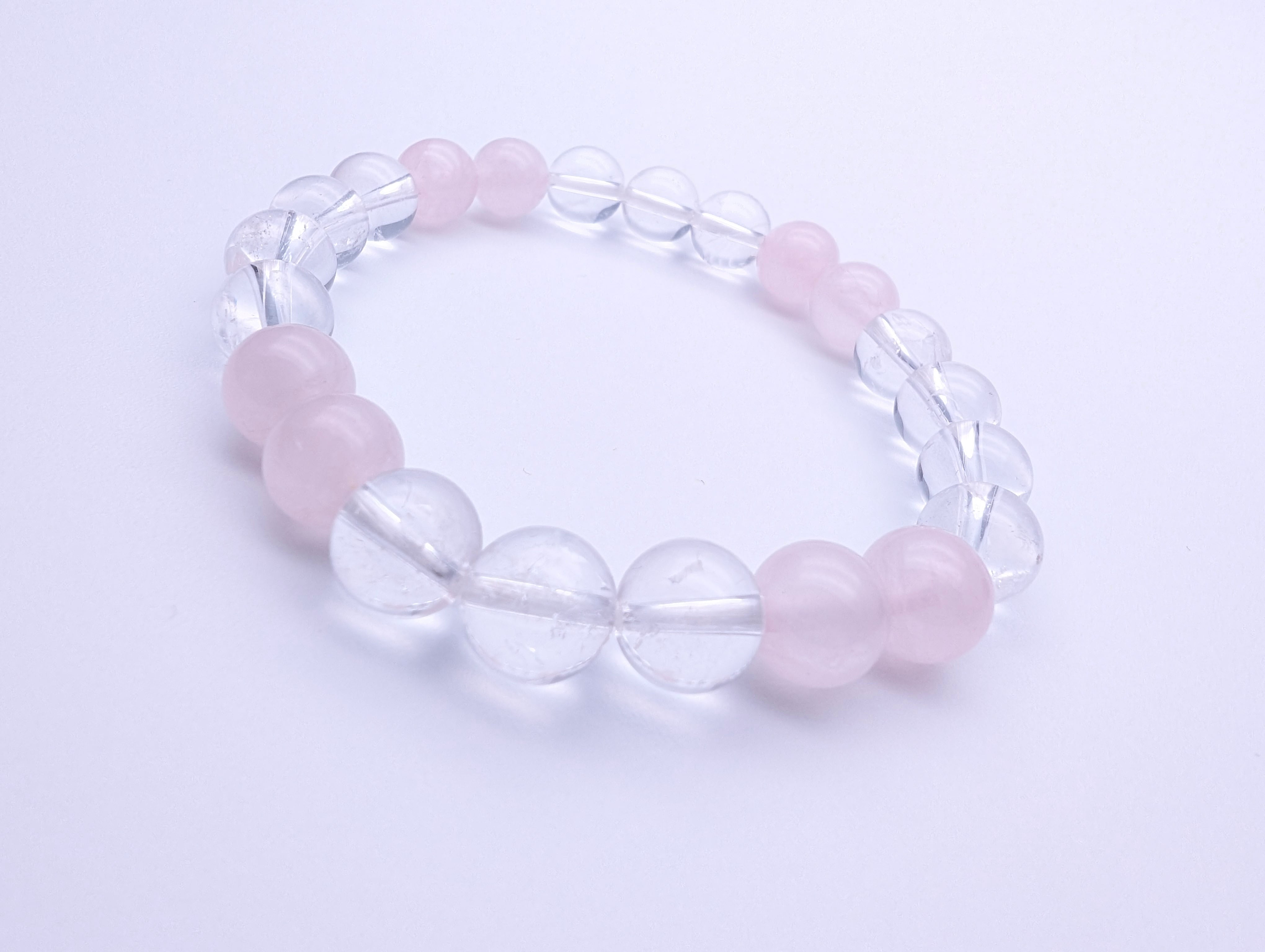 ローズクォーツの柔らかいピンク色と水晶のクリアな輝きが美しいコントラストを生み出します。サイズや形状は多様なバリエーションをご用意しておりますので、お好みに合わせてお選びいただけます。8mm/女性標準16cm/男性標準18cm