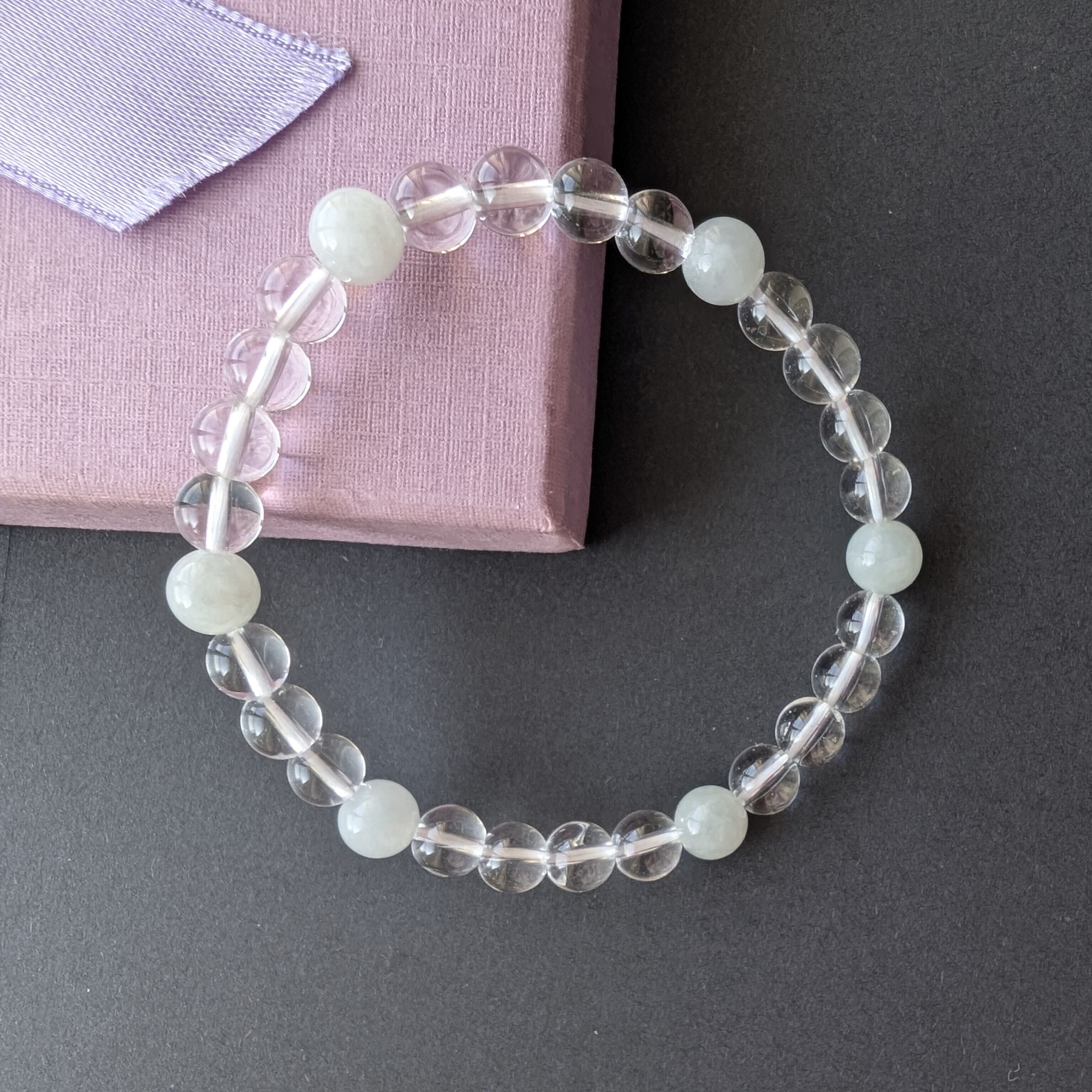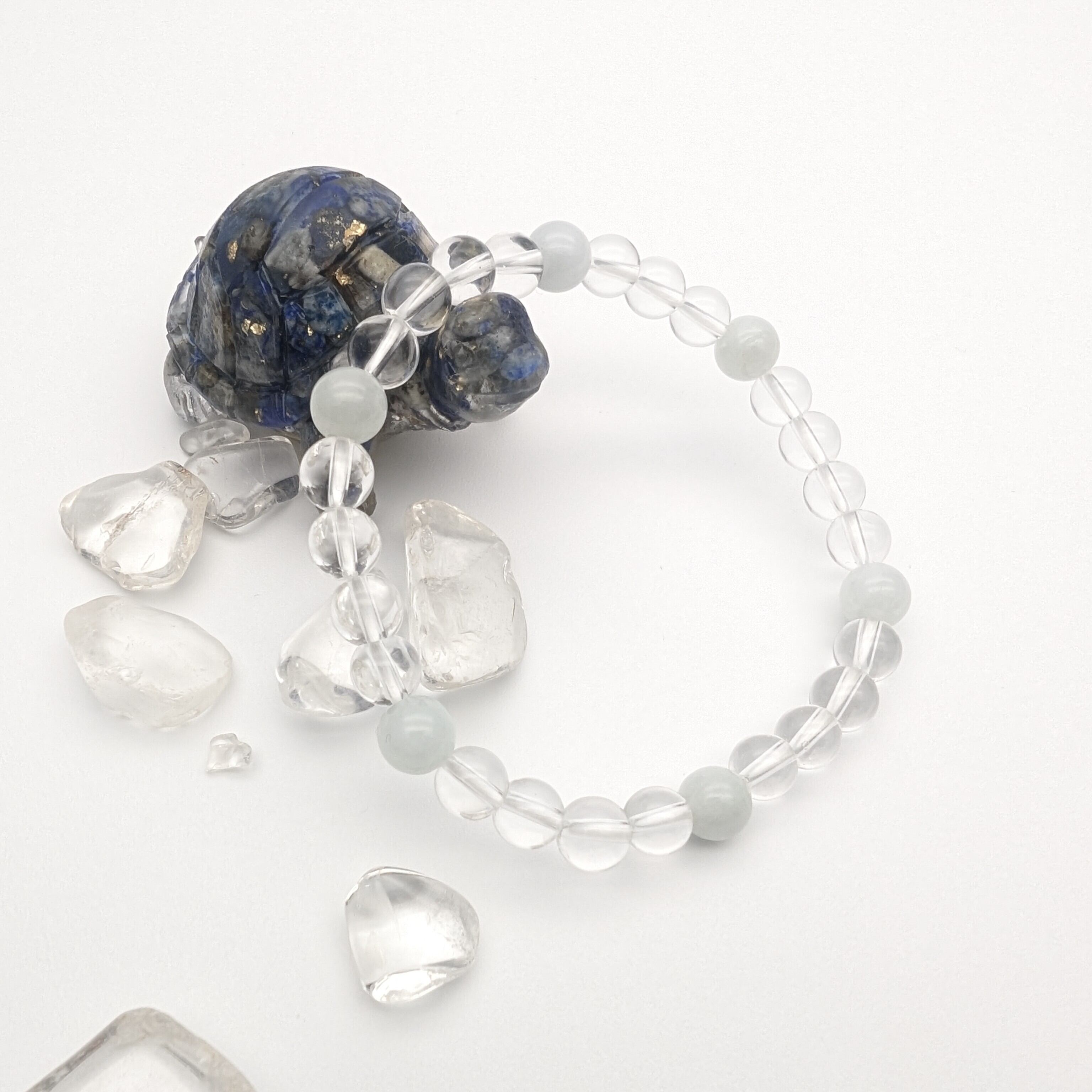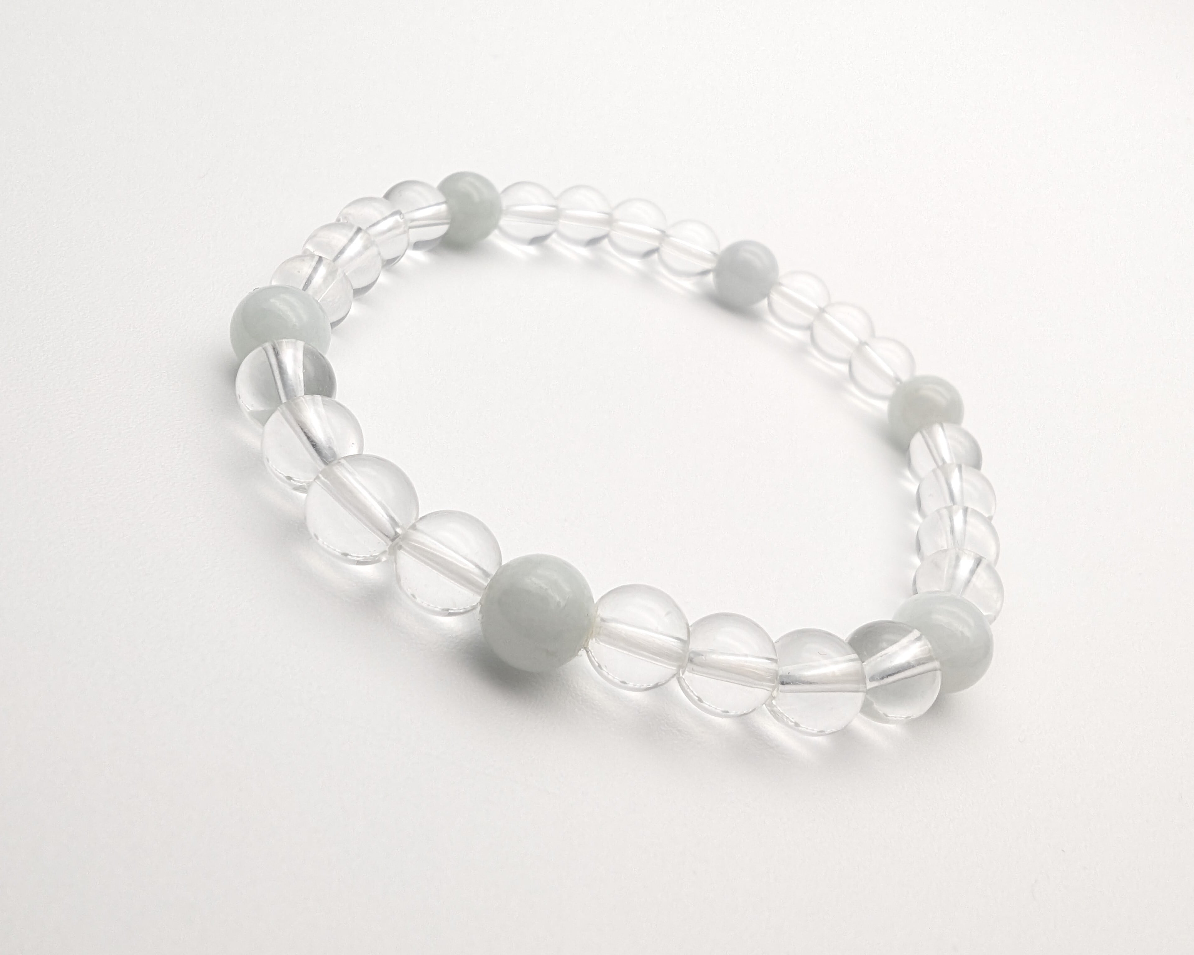 翡翠の美しい緑色と透明な水晶が調和し、穏やかな印象を与えます。サイズや形状は多様なバリエーションをご用意しておりますので、お好みに合わせてお選びいただけます。6mm/女性標準16cm/男性標準18cm