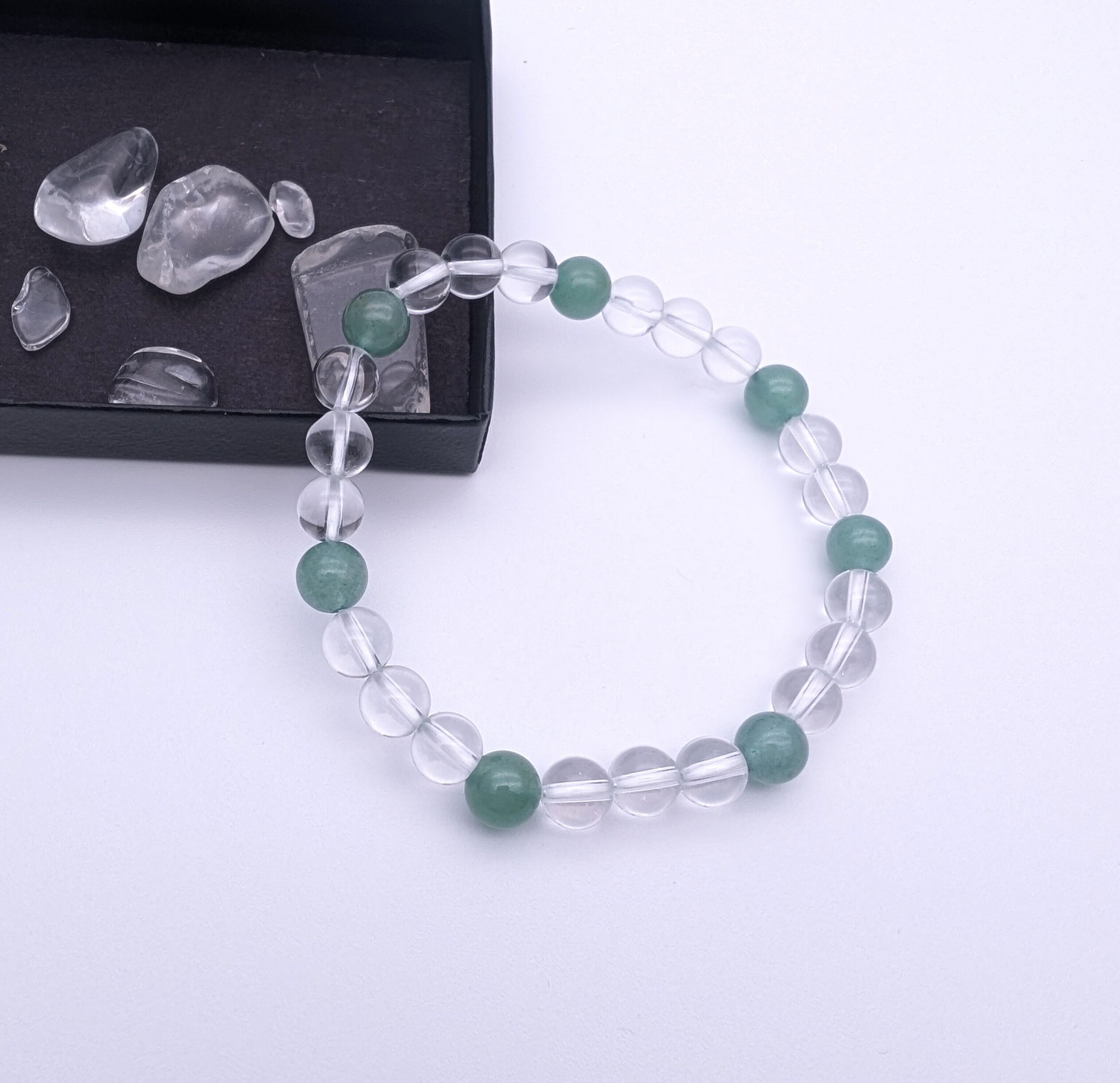 素材はアベンチュリンと水晶を使用しております。厳選された高品質な素材を用いて、長くご愛用いただける商品となっております。