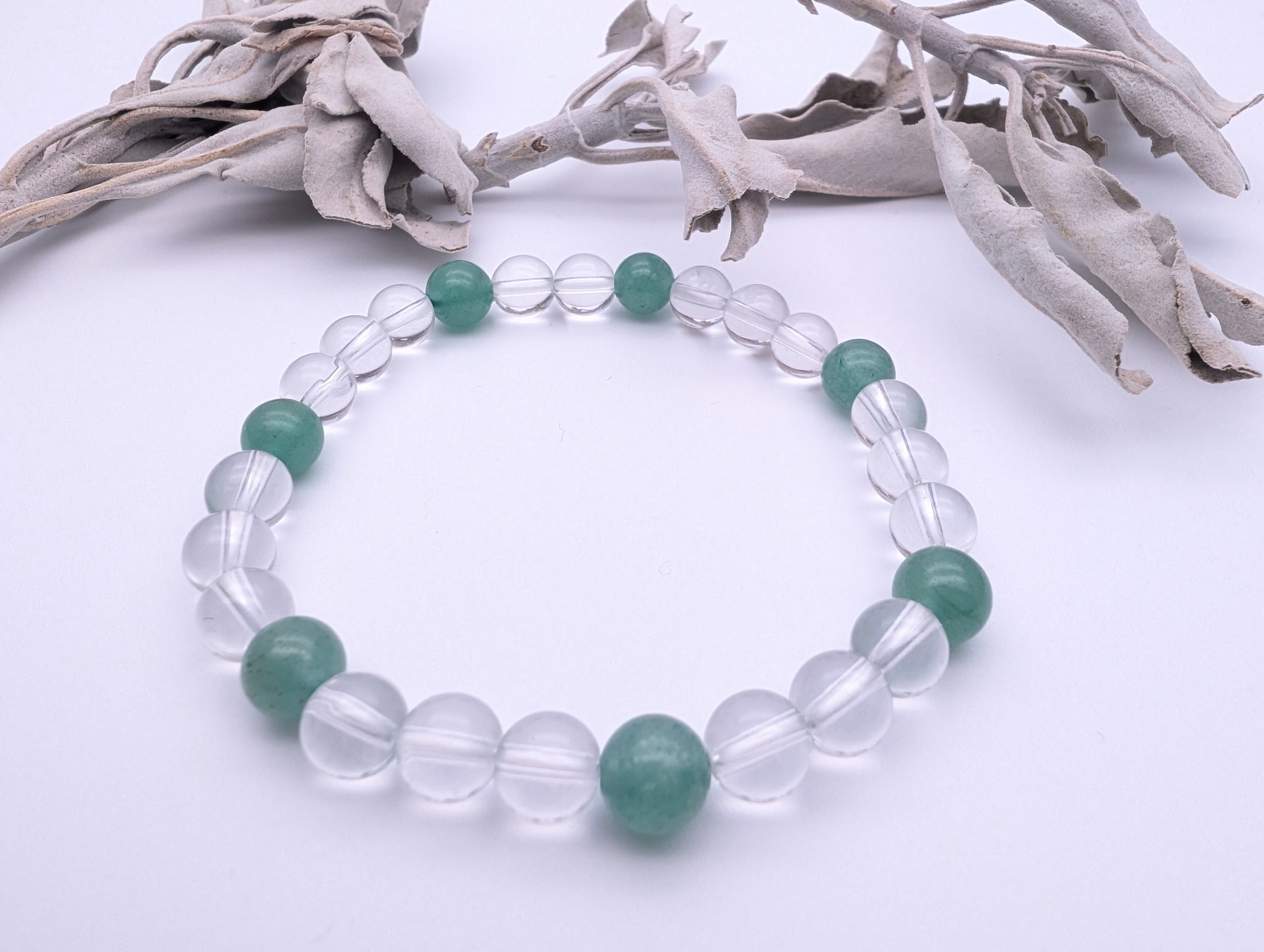 アベンチュリンの優しい緑色と透明な水晶が調和し、心を和ませる印象を与えます。サイズや形状はさまざまなバリエーションをご用意しておりますので、お好みに合わせてお選びいただけます。6mm/女性標準16cm/男性標準18cm