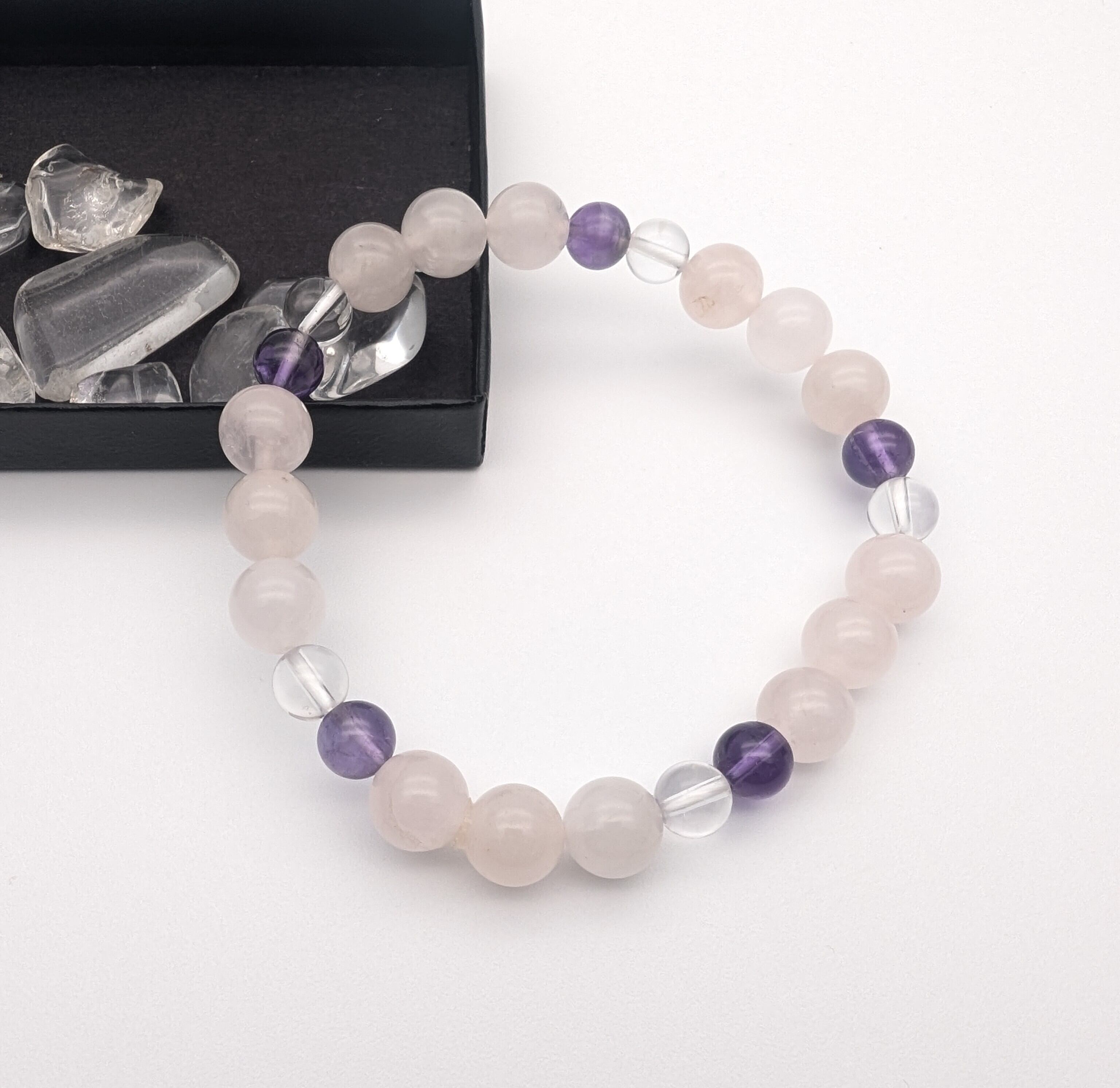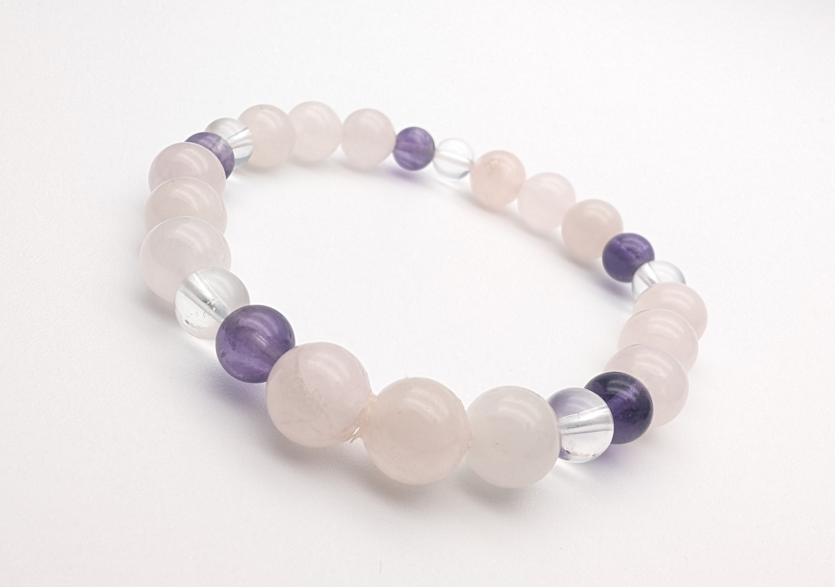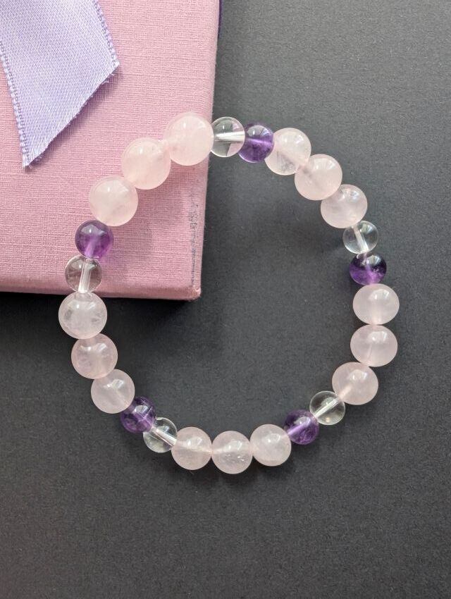 ローズクォーツの柔らかなピンク、アメジストの深い紫、透明な水晶が調和し、心を癒す印象を与えます。サイズや形状は多様なバリエーションをご用意しておりますので、お好みに合わせてお選びいただけます。ローズクォーツ8mm/アメジスト6mm/水晶6mm/女性標準16cm/男性標準18cm