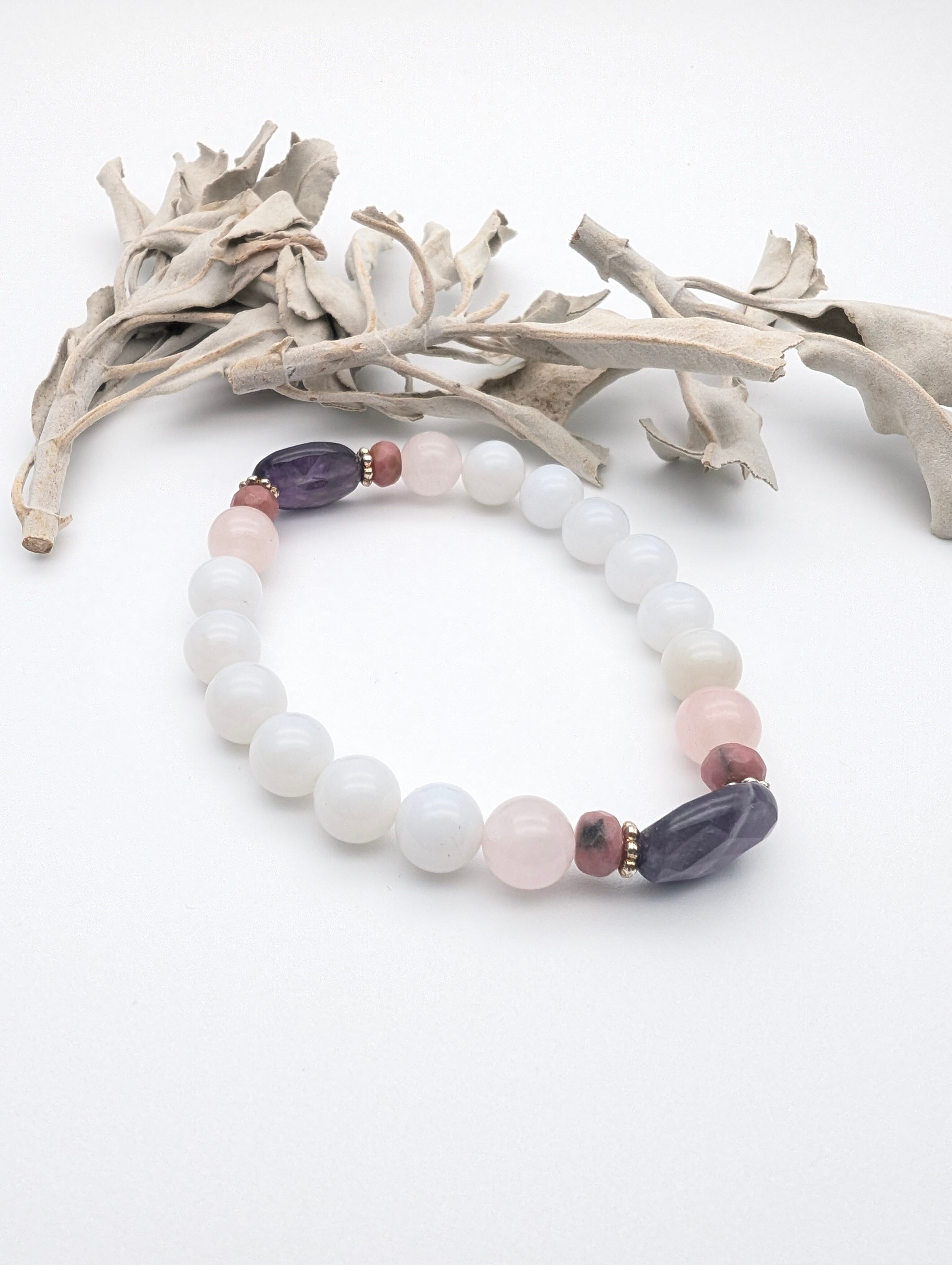高貴なイメージのアメジストが、白めのうと並んだ瞬間に、なんだかおやすみ前のホットミルクみたいに優しい表情になったんです。「この組み合わせ、絶対誰かの癒やしになる」って確信して、一番綺麗な粒たちを厳選しました。