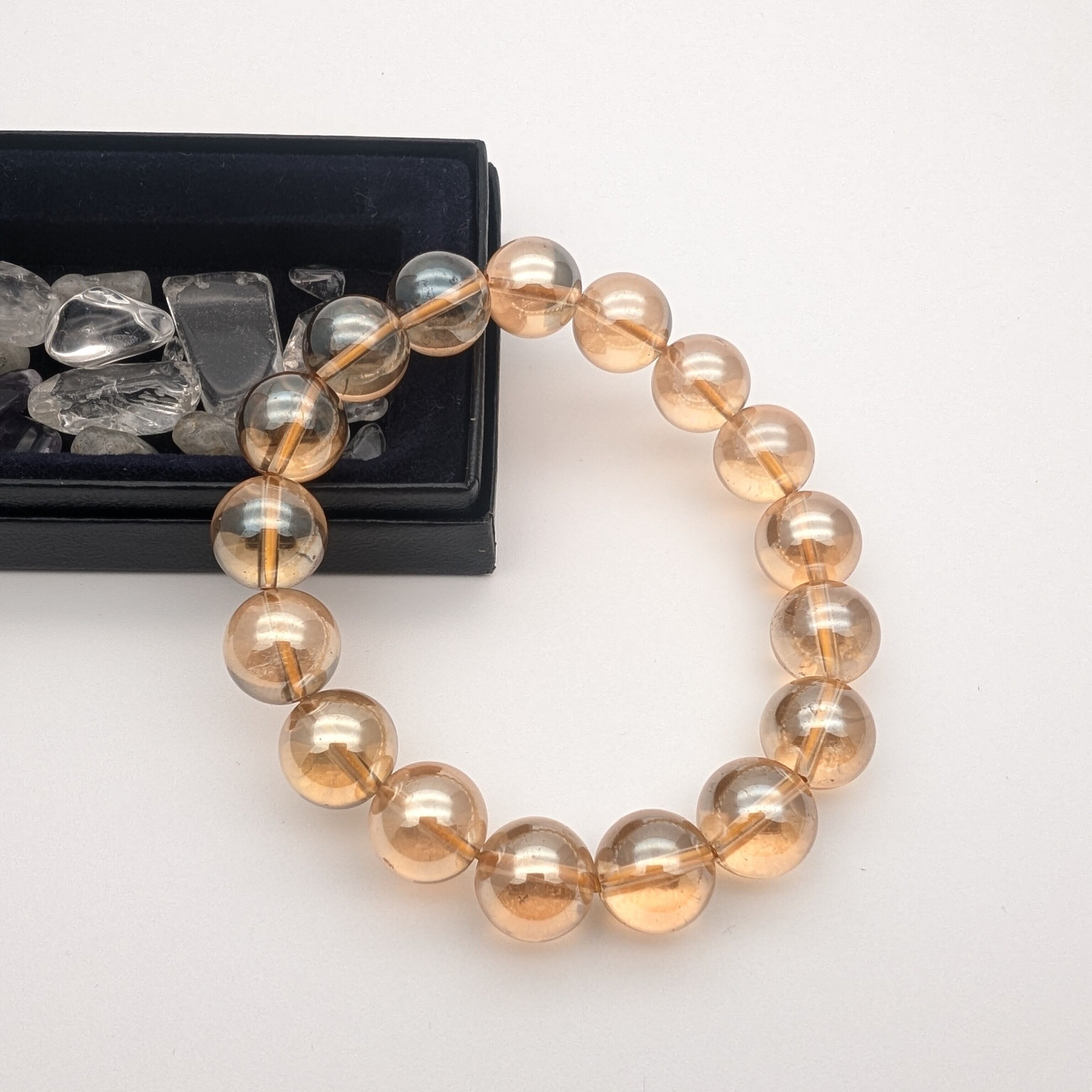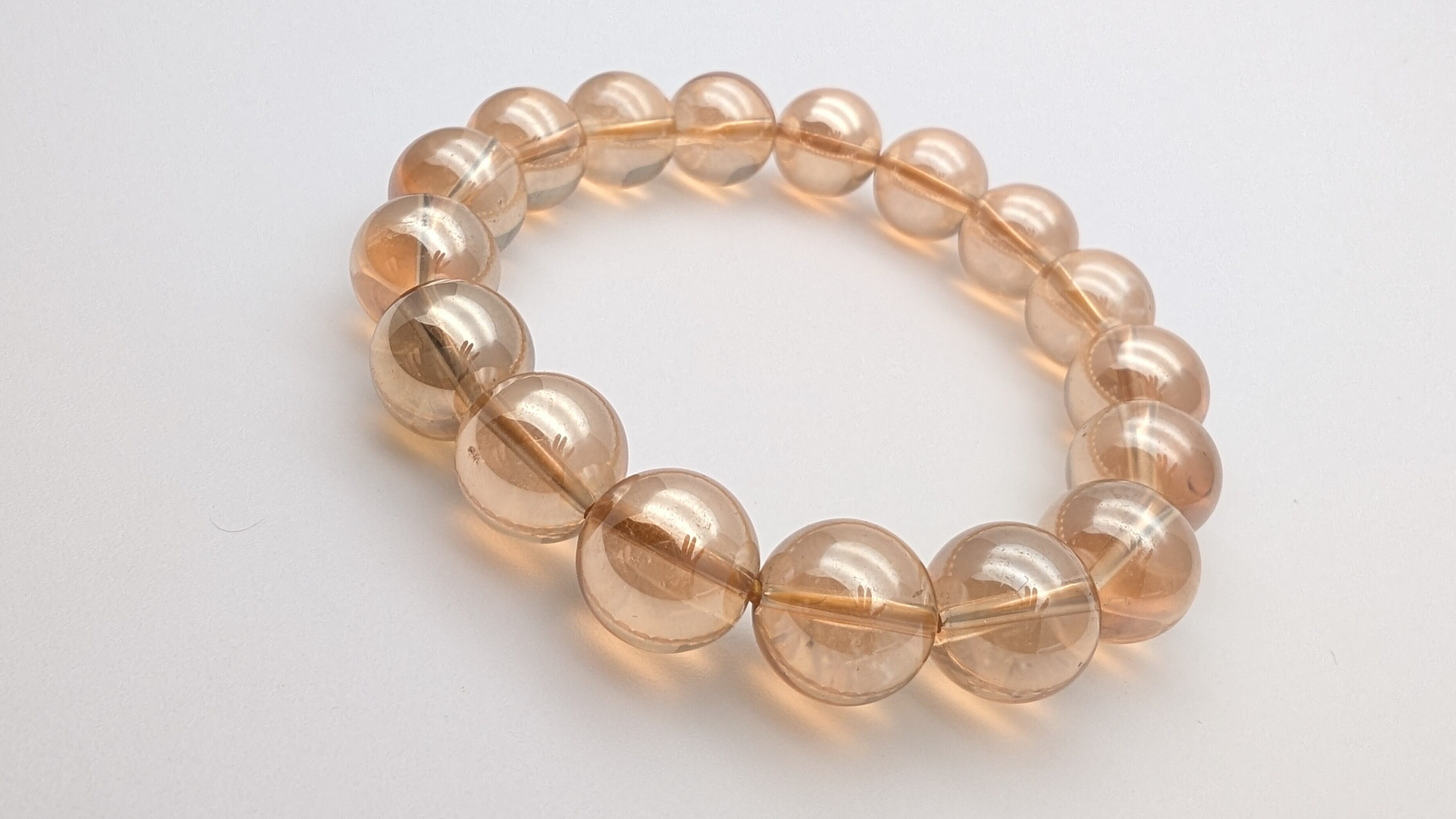 ゴールデンオーラは、煌めくオレンジが輝く魅力的な石です。画像のサイズは12-13mm、全体の長さは17-18㎝です。ハンドメイド商品ですので、お手首にぴったりのサイズをご希望の方は、お気軽に当店までご相談ください。