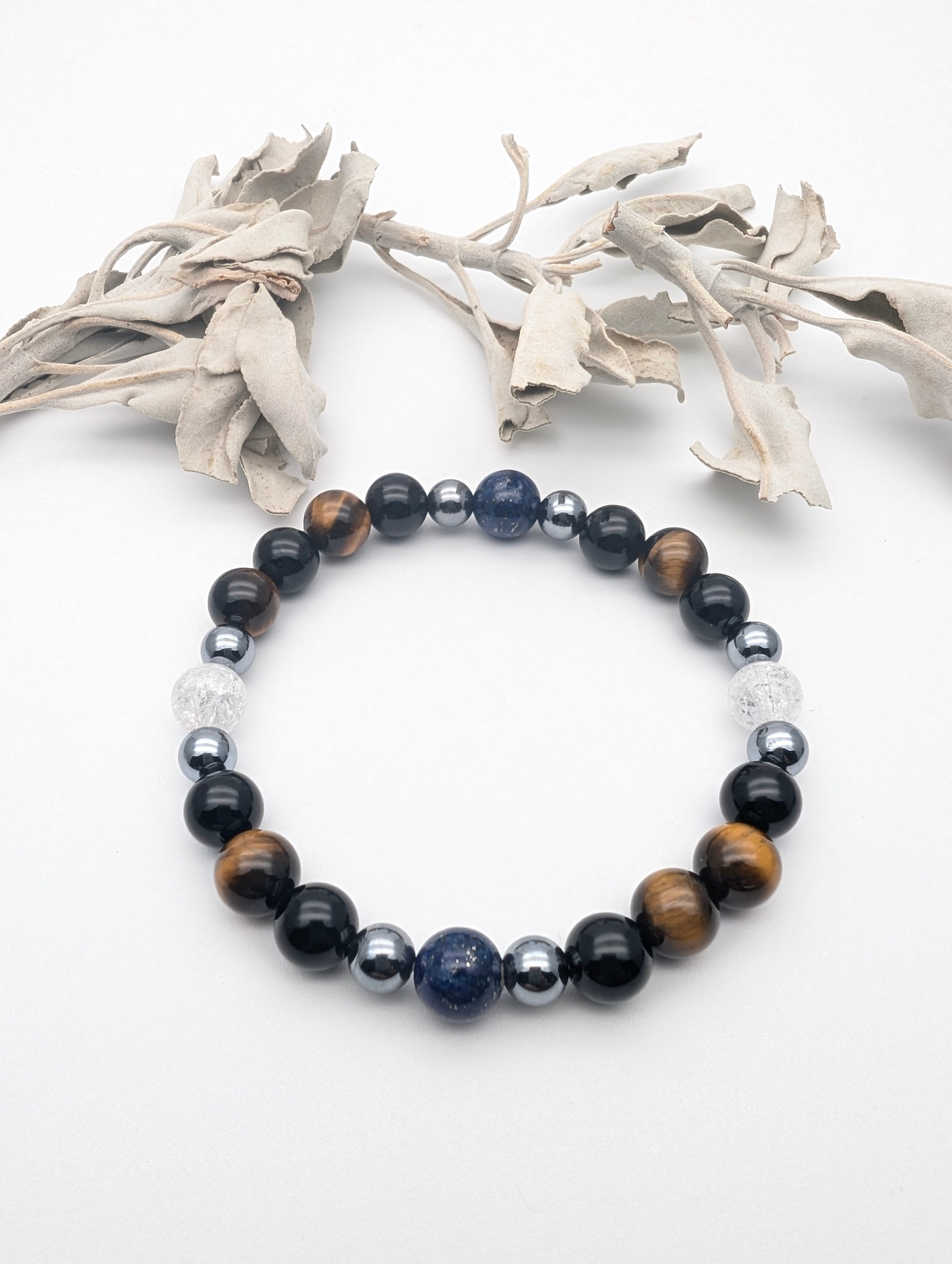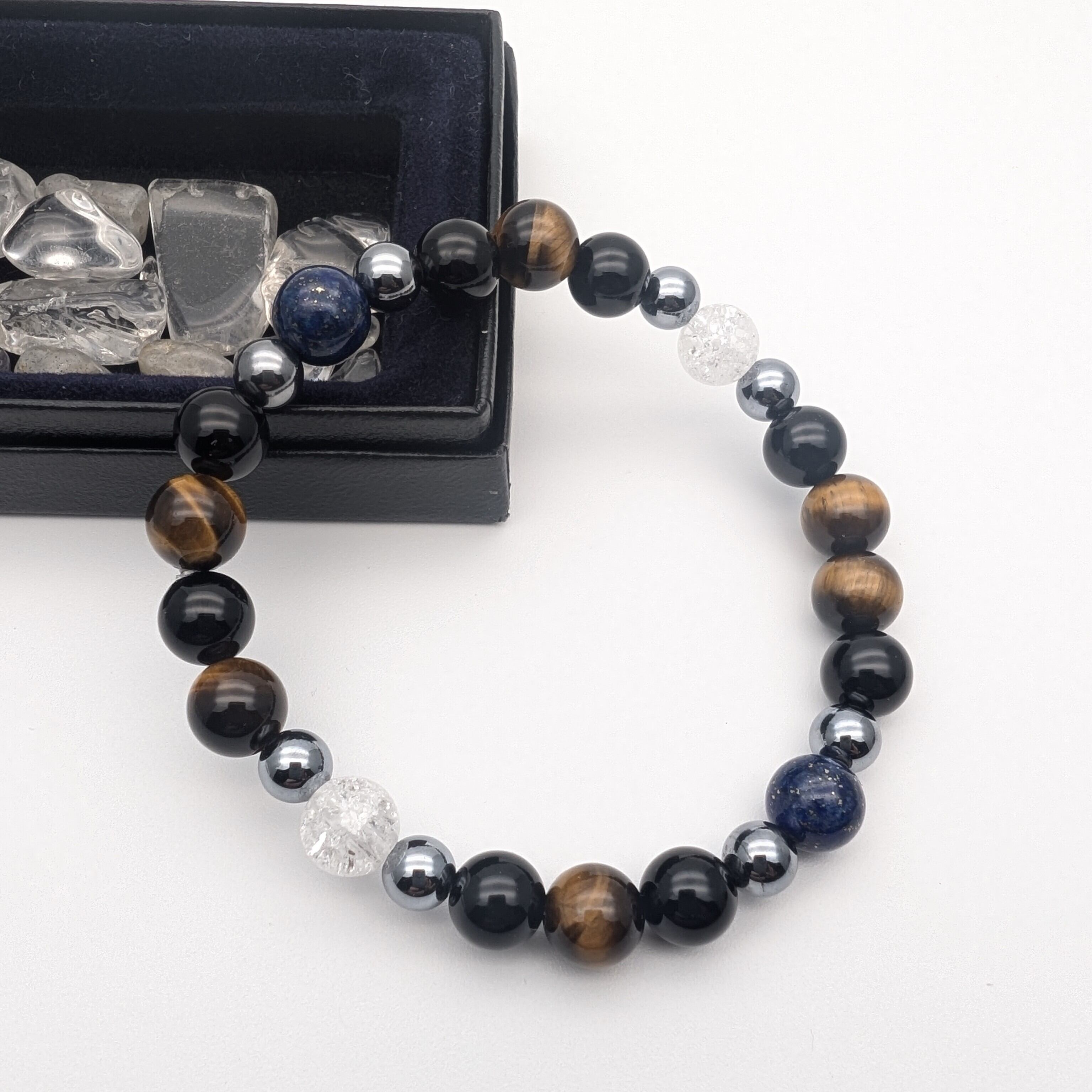 タイガーアイは、行動力を高め、困難を乗り越えるサポートをします。ラピスラズリは、真実と自己認識を促進し、オニキスは安定感を与えてくれる特性があります。これらのエネルギーが組み合わさることで、より充実した日々を実現する手助けをしてくれるでしょう。特にこのブレスレットは、心の平穏を保つ大切なサポートアイテムとなるでしょう。