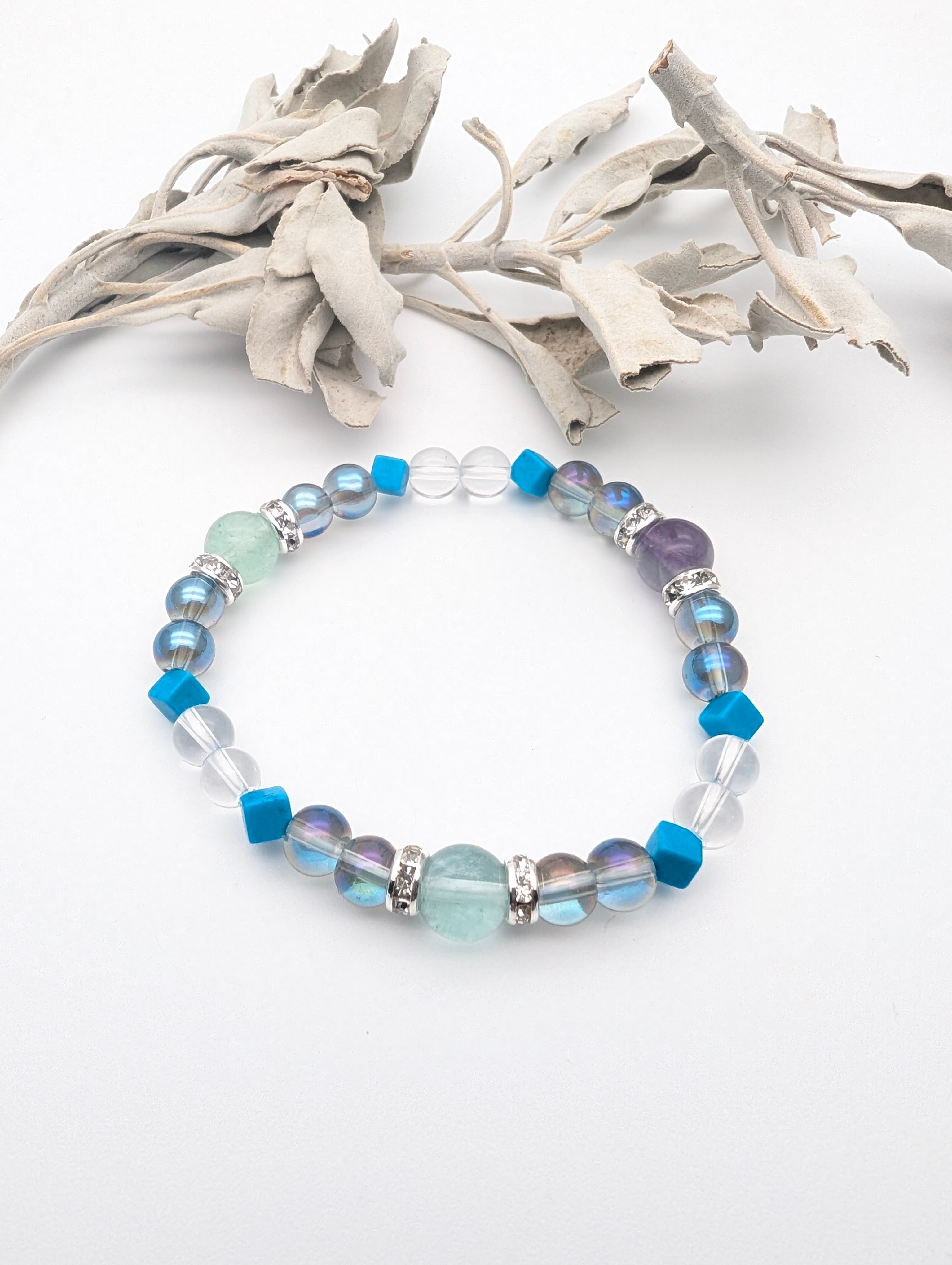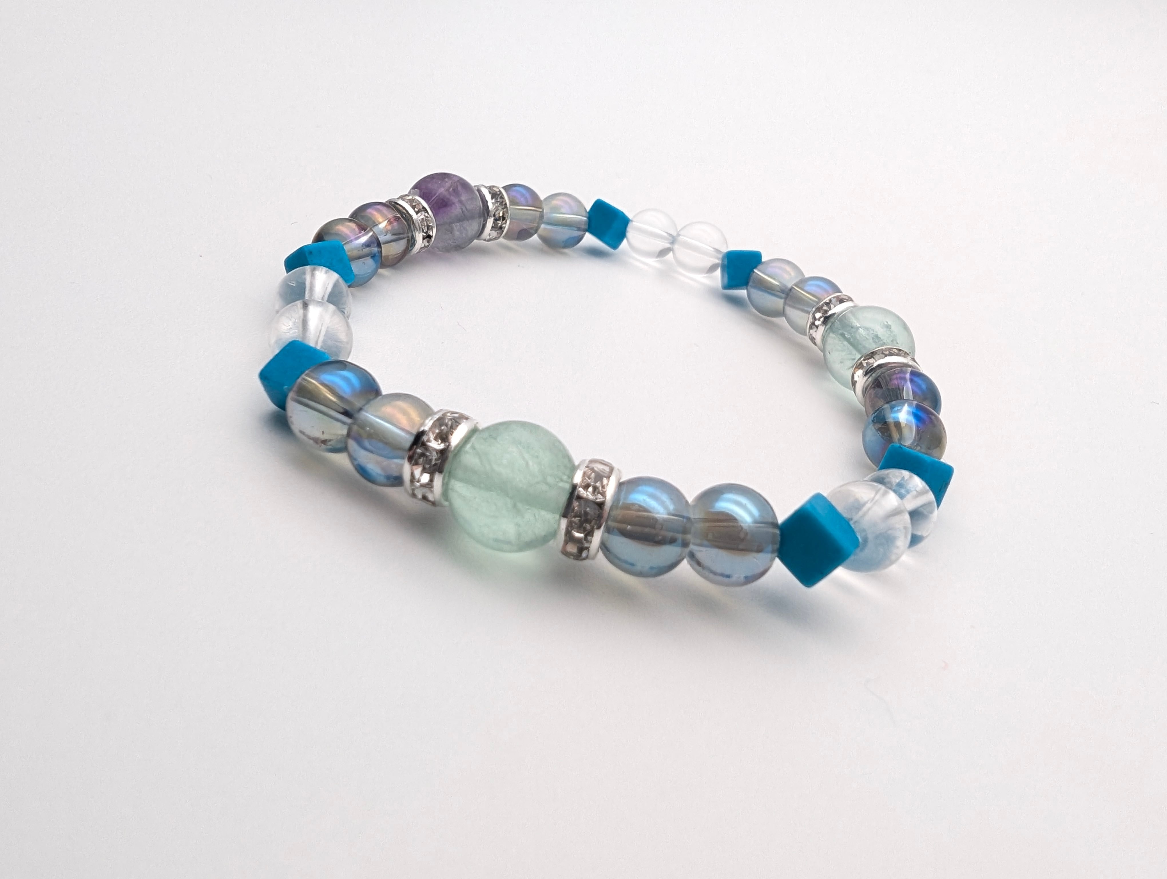 フローライトは、思考をクリアにし、集中力を高める特性があります。また、アクアオーラは、自信を引き出し、直感力を高める効果が期待できるため、心の安定を支える強力なパートナーとなることでしょう。ハウライトは、リラックス効果に優れ、感情の調和を促進します。これらのエネルギーが融合することで、より充実した日々を実現する手助けをしてくれるでしょう。