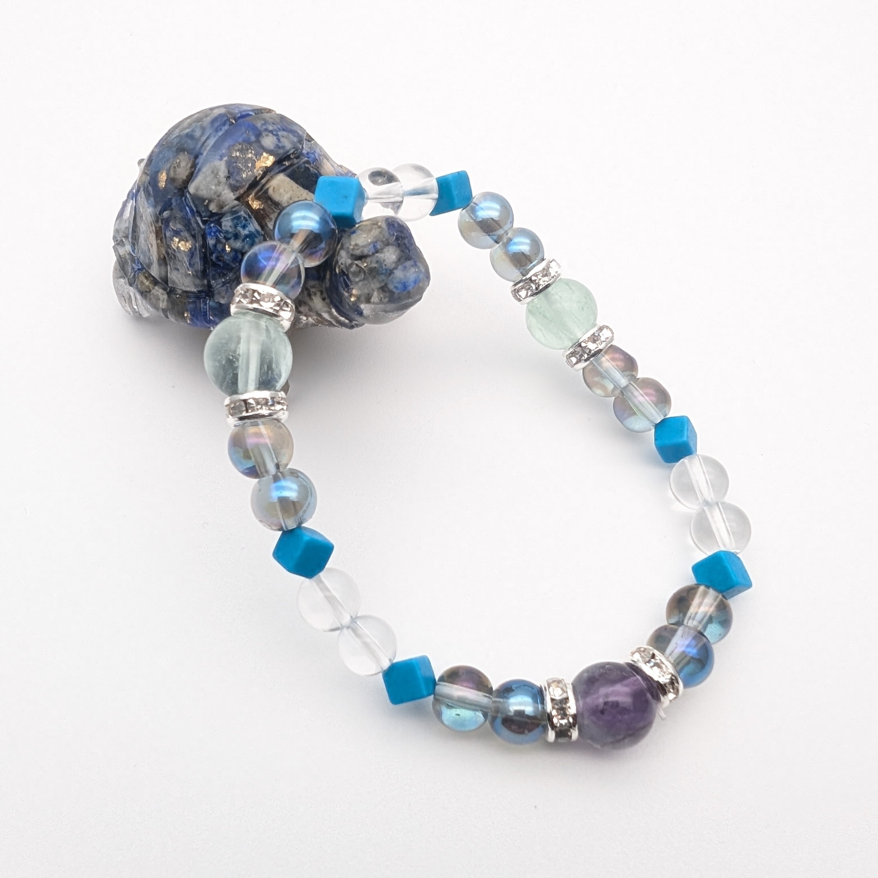 サイズはフローライト8mm/水晶6mm/アクアオーラ4mm/ハウライトパーツが、美しく重なり合い、独自の存在感を放っています。特別なサイズのご要望にもお応えいたしますので、ぜひお気軽にご相談ください。