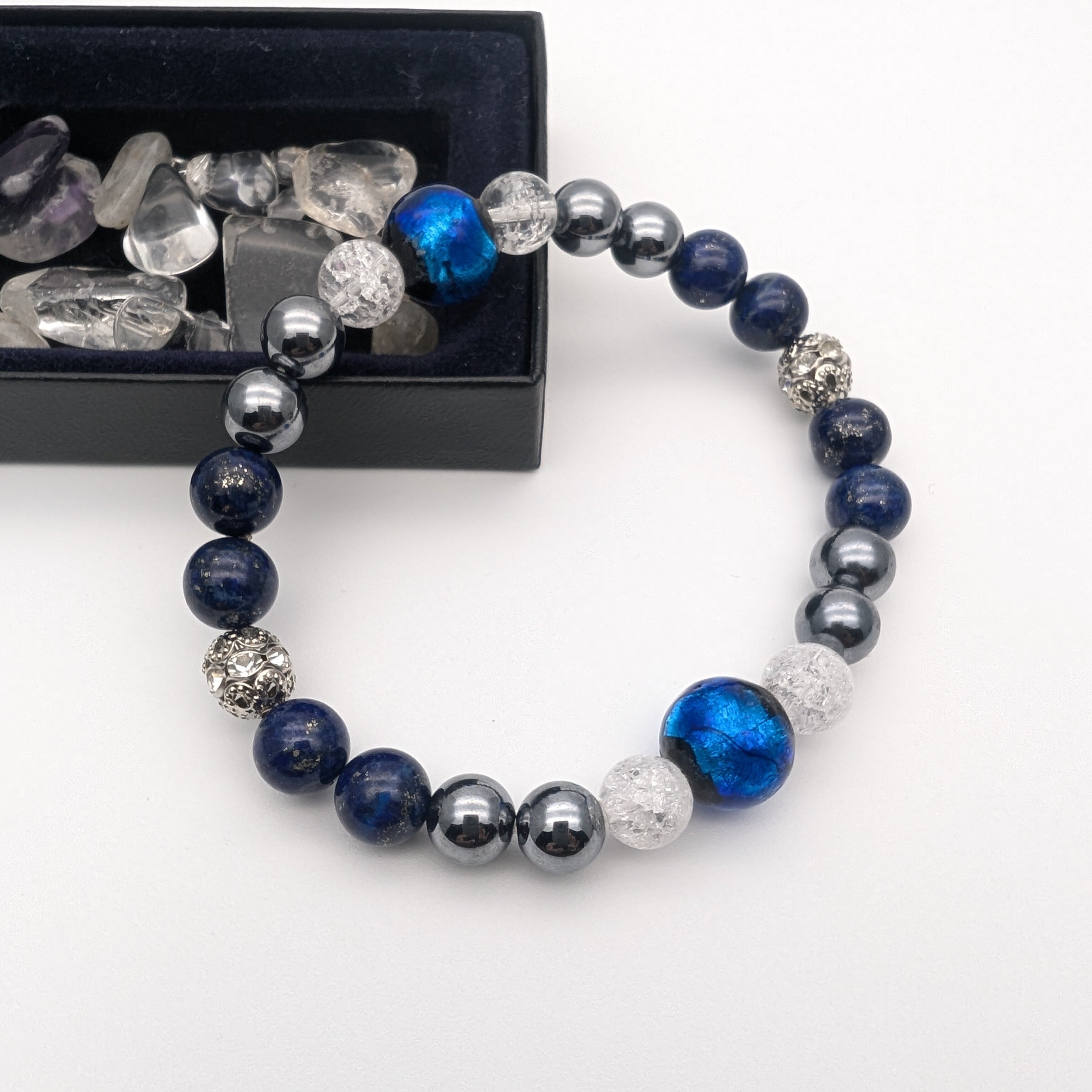 ホタルガラス青12-13mm/ラピスラズリ8mm/テラヘルツ8mm/爆裂水晶8mmの豪華な組み合わせで、シンプルながらも魅力的なデザインを実現。サイズは17㎝-19㎝で、特に男性におすすめですが、女性用のサイズ調整も心を込めて対応しますので、お気軽にご相談ください。