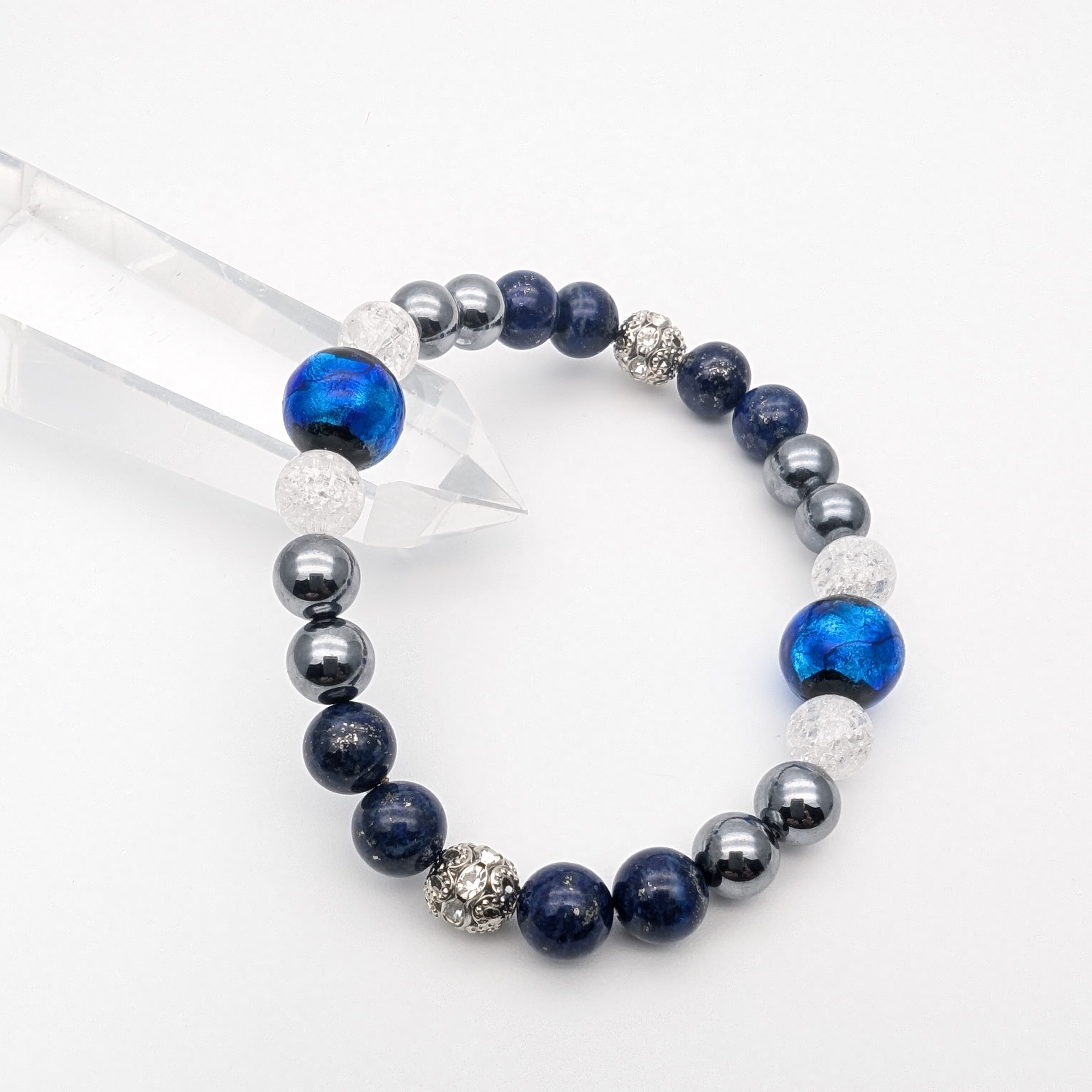 透き通るホタルガラスの青は、心の浄化を促進し、ラピスラズリのエネルギーが直感力を高め、テラヘルツの持つ波動が身体と心のバランスを整えます。爆裂水晶はその力強いエネルギーで、日常のストレスを払いのけ、持ち主の心を守る盾となります。この組み合わせで、より高い目標へ向かって一歩踏み出す後押しをしてくれます。