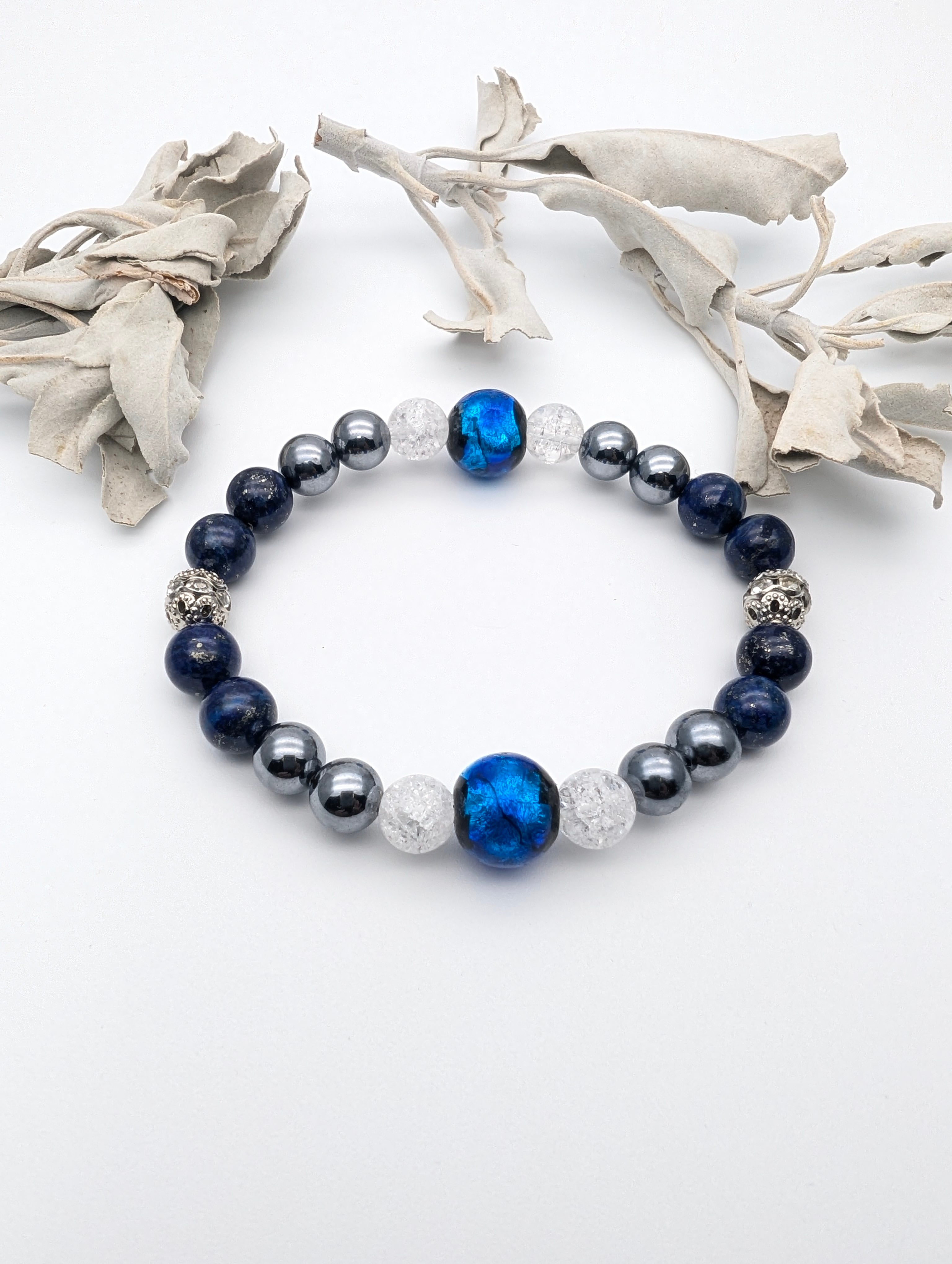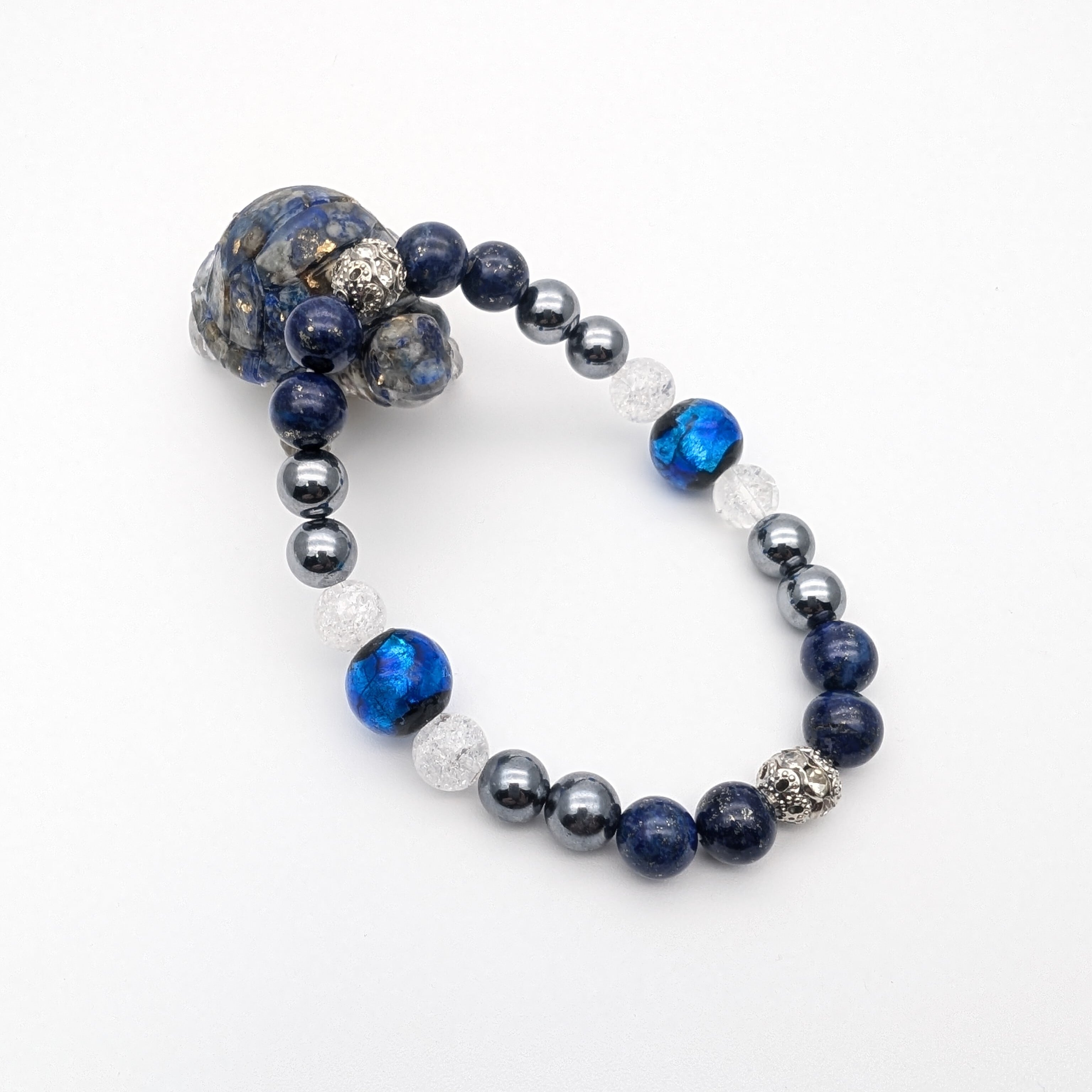 美しいホタルガラスの青と神秘的なラピスラズリ、そしてエネルギーを感じるテラヘルツ、力強い爆裂水晶が揃ったこのジュエリーは、持ち主に深い安らぎと力を与えるためにデザインされています。持つ人の心を落ち着け、未来に向けての道を照らすかけがえのない存在です。